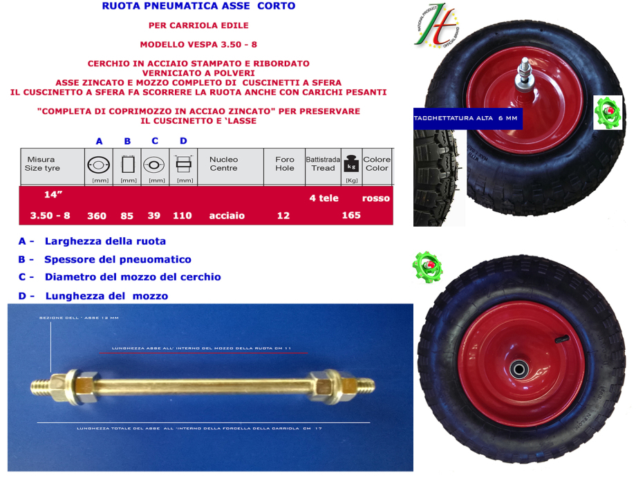 Ruota carriola Pneumatica 3.50-8  Asse Corto
